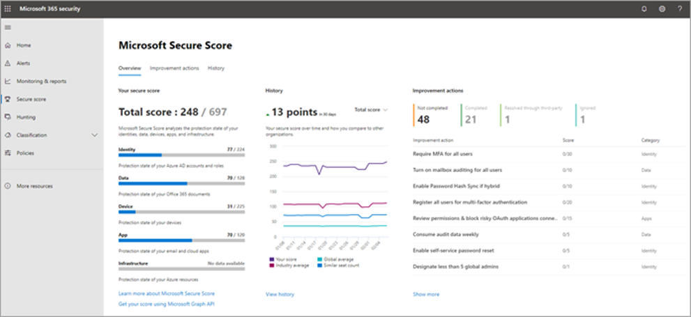 Прежде чем начать, проверьте свой рейтинг безопасности Microsoft 365 в центре безопасности Microsoft 365. С помощью централизованной панели мониторинга вы можете отслеживать и улучшать безопасность своих профилей, данных, приложений, устройств и инфраструктуры Microsoft 365. За настройку рекомендуемых функций безопасности, выполнение задач связанных с безопасностью (таких, как просмотр отчетов) или выполнение рекомендаций сторонним приложением или программным обеспечением Вам начисляются очки. Благодаря дополнительным аналитикам и более широкому набору продуктов и служб Microsoft вы можете уверенно сообщить о работоспособности системы безопасности oрганизации.