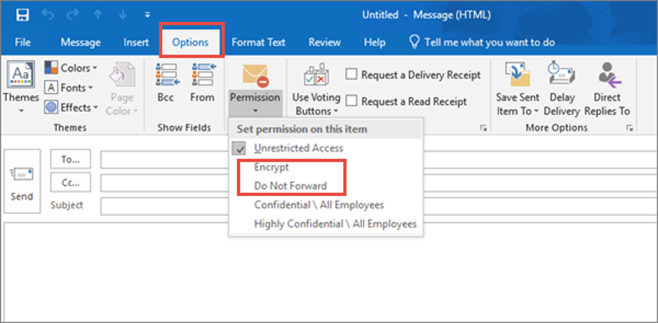 В десктопной версии Outlook выберите Параметры в сообщении электронной почты, а затем выберите Разрешения.