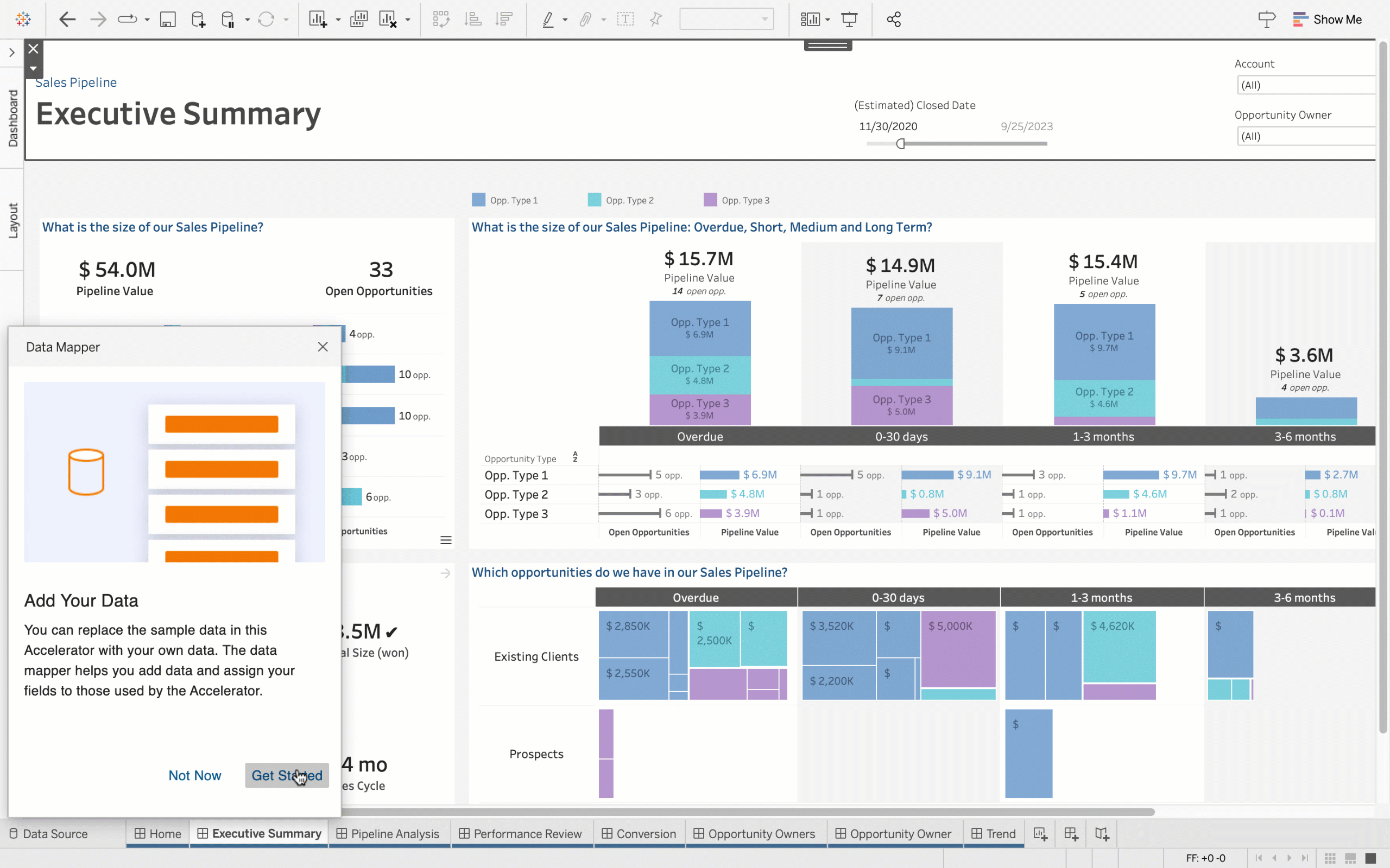 Tableau Accelerators построены с использованием образцов данных, которые вы заменяете на свои собственные. После подключения данных вы можете получить информацию о конкретных отраслях и отделах, но первоначальная настройка до сих пор была полностью ручной.