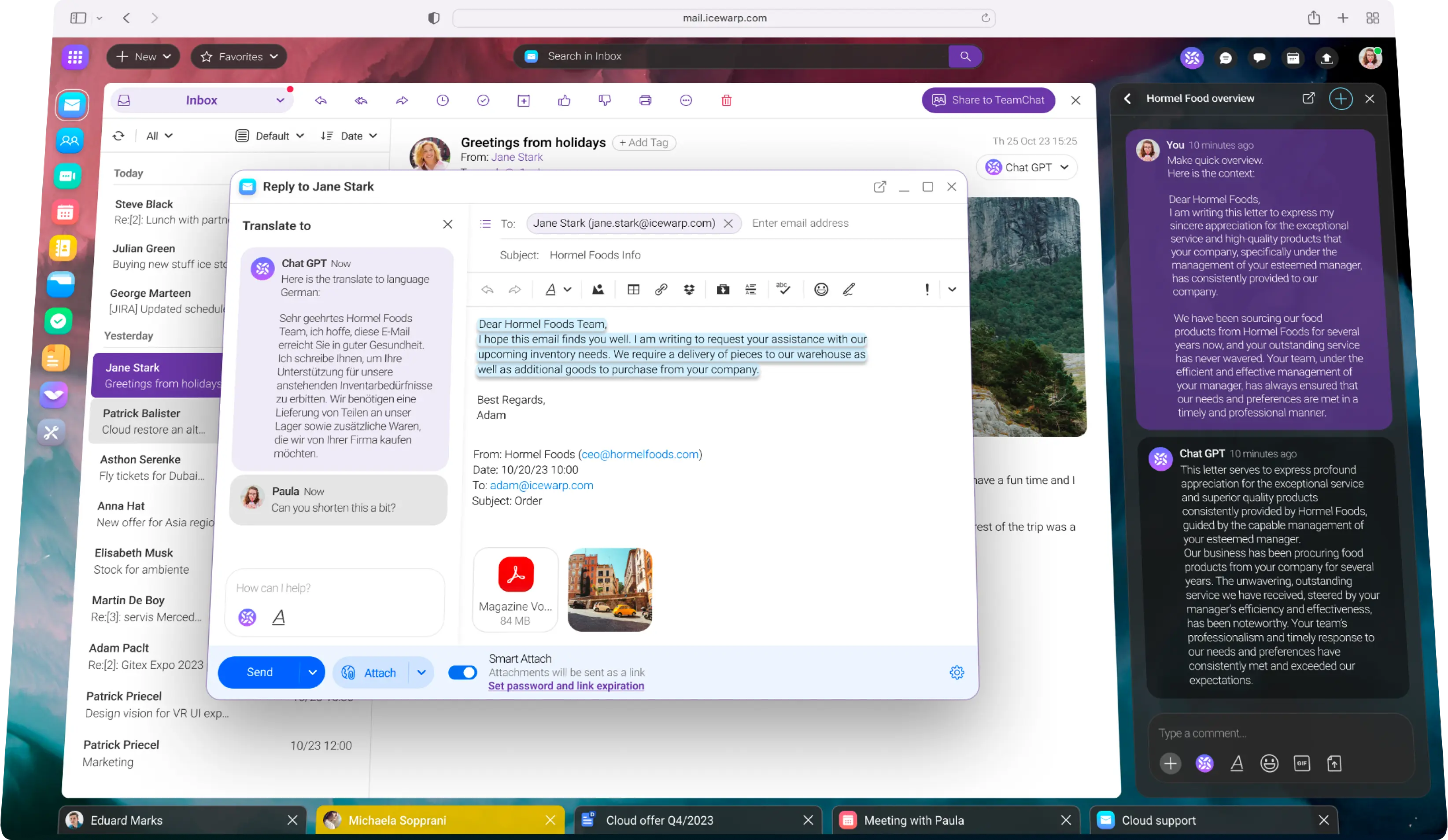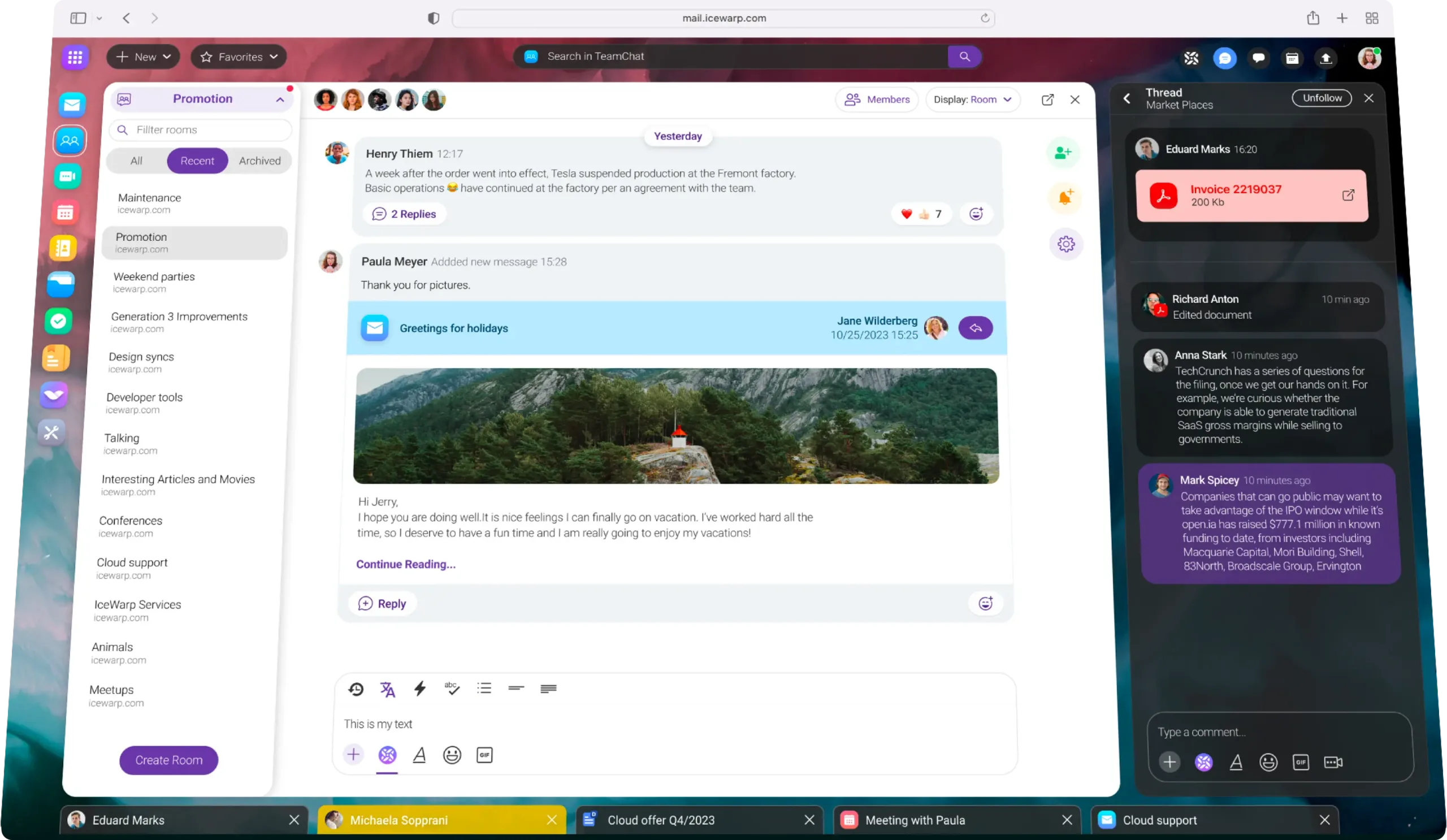 Компания IceWarp известна своими инновационными подходами к коммуникационным технологиям, такими как использование искусственного интеллекта для повышения эффективности работы с электронной почтой и управления задачами. IceWarp активно развивает свои продукты, стремясь предложить пользователям современные и надежные инструменты для организации рабочего процесса.