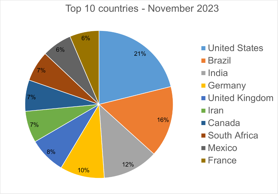 Всего в этом месяце в базе данных были обнаружены программы-вымогатели из 143 стран. Ransomware продолжает оставаться угрозой, которая затрагивает практически весь мир. Ниже представлен список 10 стран, наиболее подверженных атакам Ransomware. Многие атаки Ransomware по-прежнему носят случайный характер, и размер совокупности зависит от количества обнаружений.