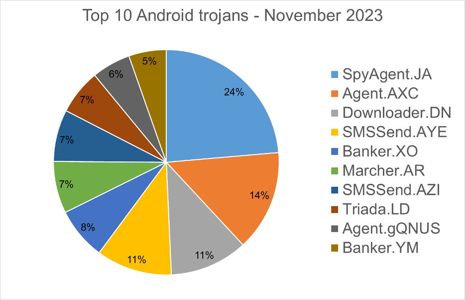 Ниже представлены 10 наиболее популярных троянских программ для Android, обнаруженных в телеметрии Bitdefender за ноябрь 2023 года.