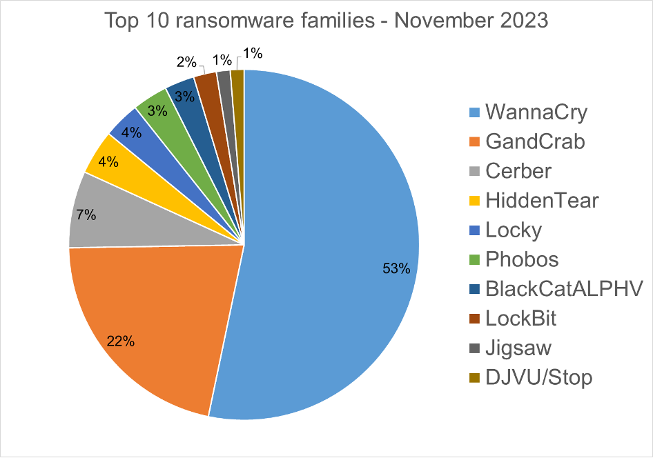 Фишинговые атаки часто служат первым этапом атаки, а заражение Ransomware – последним. Этот отчет анализирует обнаружения вредоносного ПО, полученные в ноябре 2023 года от статических систем защиты. Примечание: Обратите внимание, что в отчете учитывается только общее количество случаев атак, а не степень финансового ущерба. Злоумышленники, действующие по принципу “Opportunistic”, и некоторые группы Ransomware-as-a-Service (RaaS) составляют более высокий процент по сравнению с группами, которые более тщательно подходят к выбору своих целей, предпочитая количество атак, а не их качество.