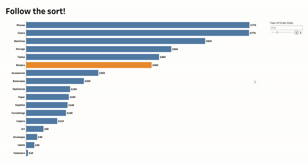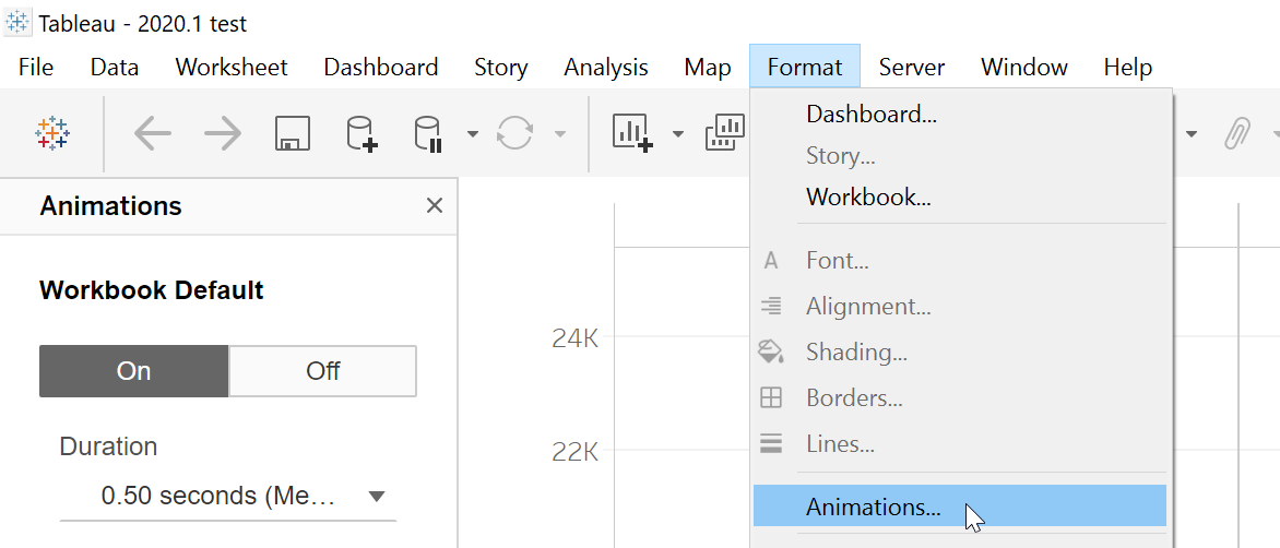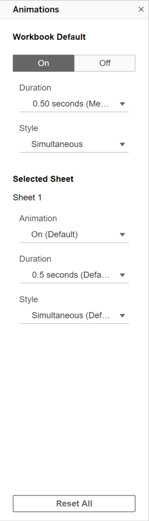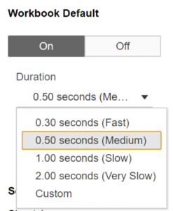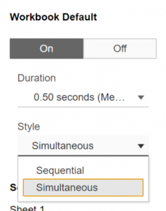 Данное меню может показаться менее интуитивным. По сути, это связано с тем, как Tableau обрабатывает переходы и “визуализирует” кадры. Когда у вас много элементов на графике, Tableau визуализирует движение пошагово. Например, если у вас гистограмма, которая изменяет порядок сортировки, и есть цвет, Tableau визуализирует каждую часть в индивидуальном порядке. Изменение размеров столбцов – это один шаг, порядок столбцов – второй, изменение цвета – третий и так далее.