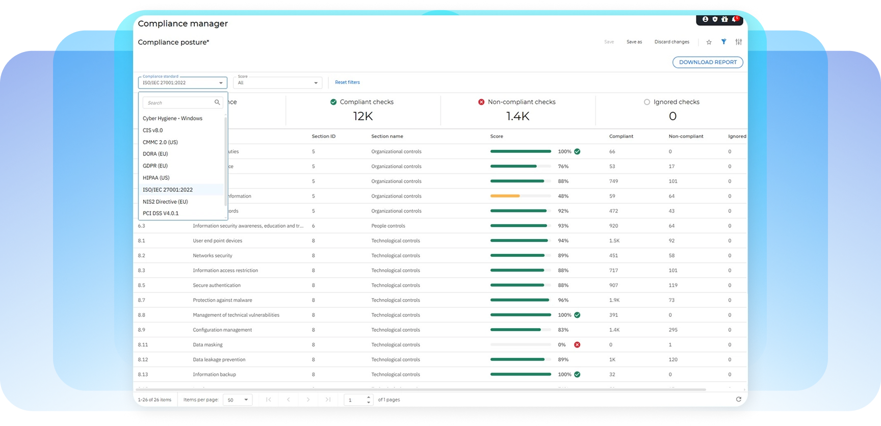 GDPR, PCI DSS, NIS2, SOC 2, HIPAA, ISO 27001 — усі вимоги вже є в системі, не треба збирати чеклісти вручну.
