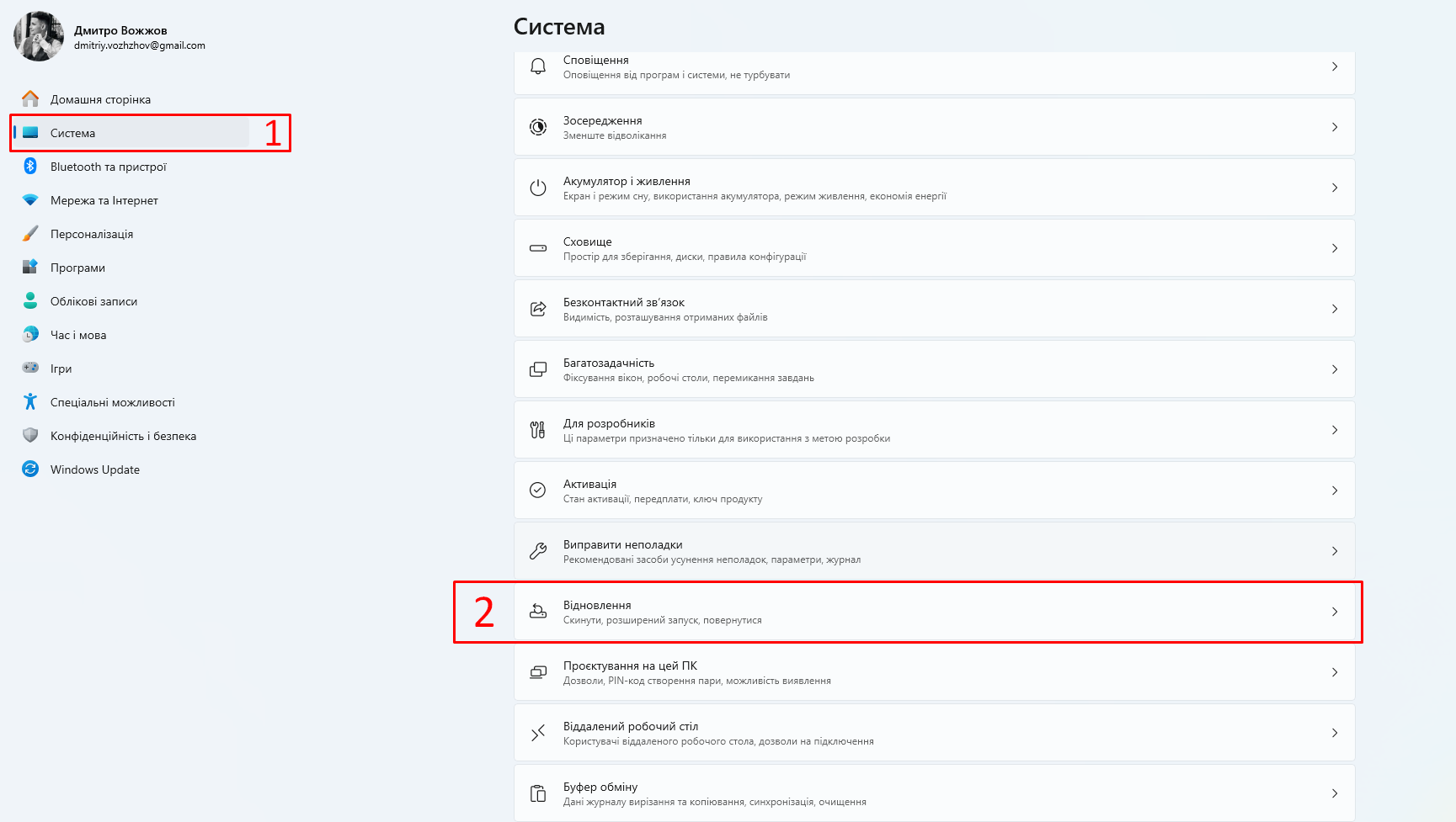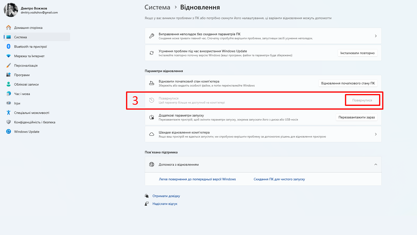 - Якщо минуло менше 10 днів після оновлення, у Параметри → Система → Відновлення натисніть “Повернутися”.
