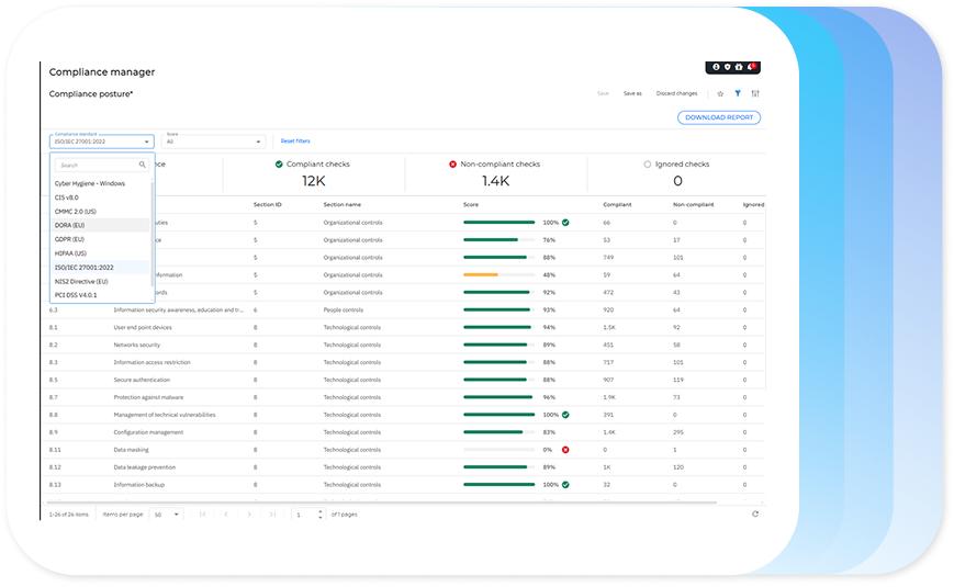 GDPR, PCI DSS, NIS2, SOC 2, HIPAA, ISO 27001 — усі вимоги вже є в системі, не треба збирати чеклісти вручну.