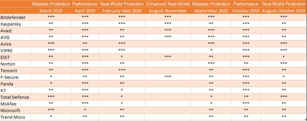 Протягом всього 2019 року продукти Bitdefender впевнено отримували найвищі бали. Ці результати наглядно можна побачити в рейтинговій таблиці:
